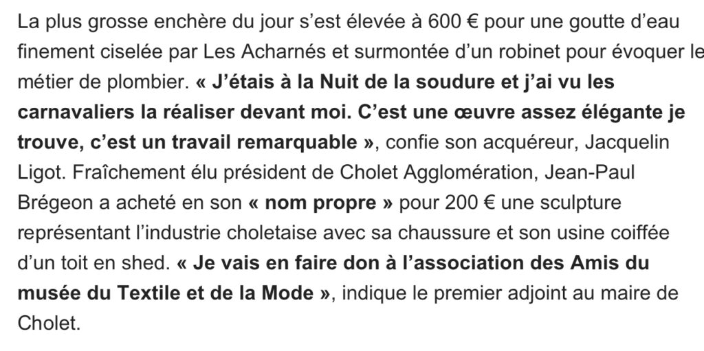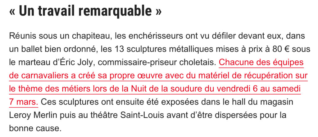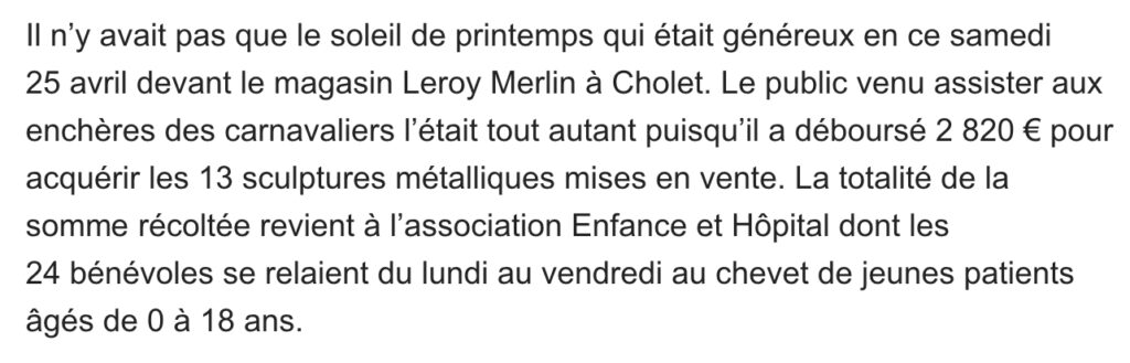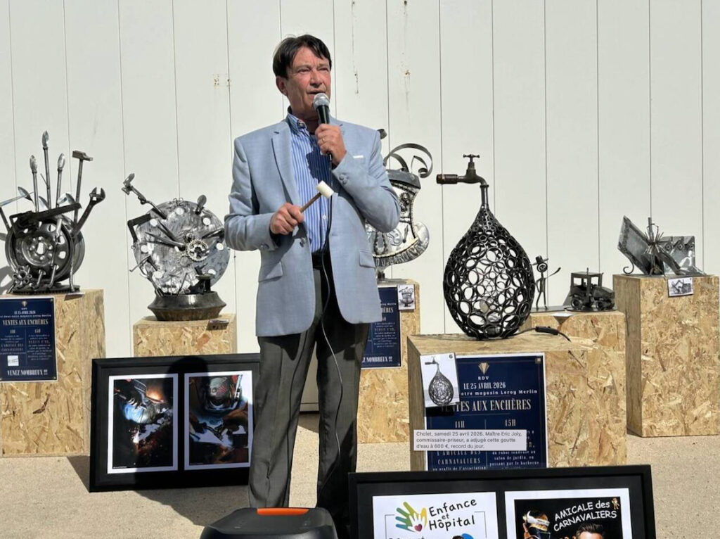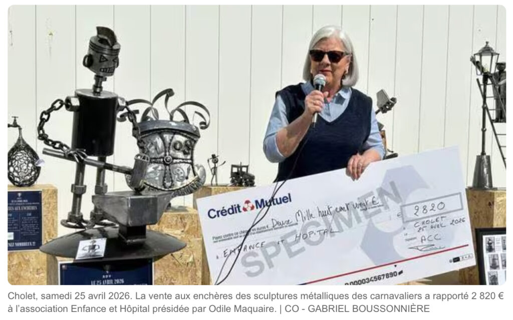 25 avril 2026 – La vente aux enchères des sculptures métalliques réalisées par les carnavaliers de Cholet au cours de la Nuit de la Soudure a permis de récolter 2 820 €. Cette somme est intégralement reversée à l’association Enfance et Hôpital qui se porte au chevet des enfants malades. Les dons, qui peuvent s’ajouter à cette somme, sont aussi les bienvenus.