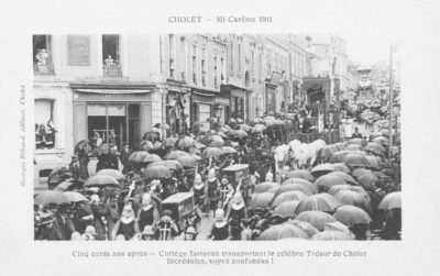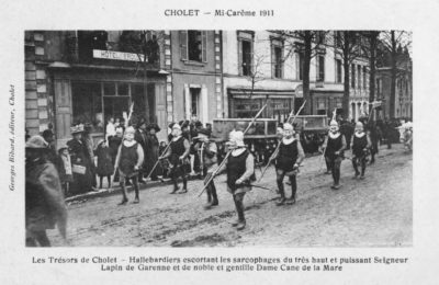 1411 : C’était alors la Guerre de Cent ans. Un trésor anglais aurait été caché à Cholet. Le 26 mars 1911, devant le char, des cercueils sont portés avec dignité sur les épaules de solides gaillards, de pseudo-croque-morts grimés comme des poupées. Ils sont escortés par des gardes casqués tenant hallebardes.