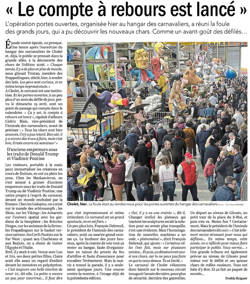 Ce matin 8 mars 2026, un soleil tranquille invite Choletaises et Choletais, ligériennes et ligériens, des plus petit aux plus grands, des novices aux habitués, à découvrir les chars carnavalesques de cette année, en oubliant tous les autres soucis de la vie de tous les jours.