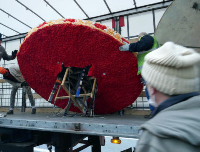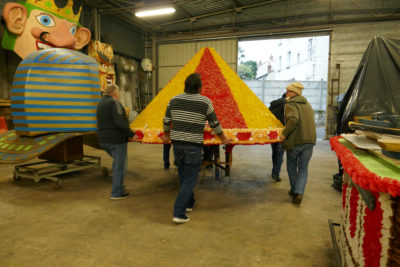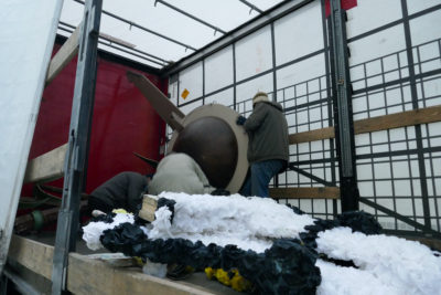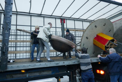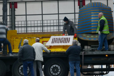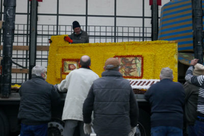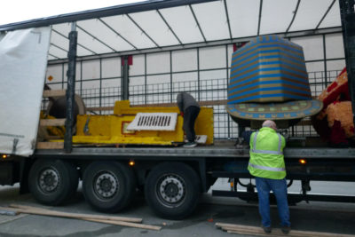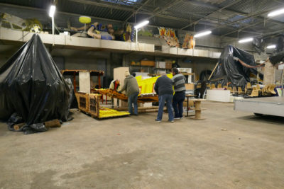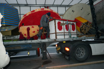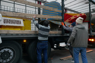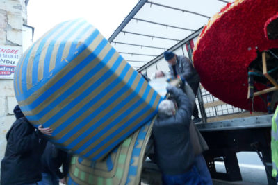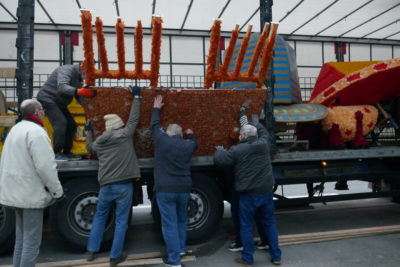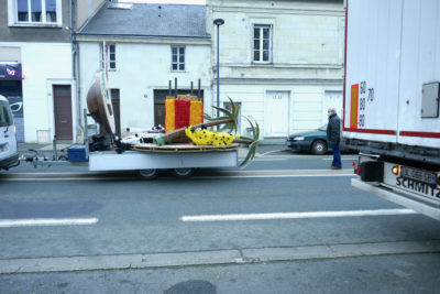 Dans l’après-midi du 11 janvier 2021, une semi-remorque des Transports Beade d’Agen est arrivée à Saumur, devant le hangar de Bagneux, rue du Pont Fouchard. Pendant plus d’une heure, trois équipes de bénévoles saumurois (Chemin-Vert, Beaurepaire – Saint-Nicolas, Les Ponts) ont participé au chargement de ce long camion qui a rejoint Agen le lendemain après-midi. Pour Daniel son chauffeur expert et souriant, une première et une dernière : le transport de décors de chars. (Il prendra une retraite bien méritée en fin d’année, nous a-t-il confié.)
