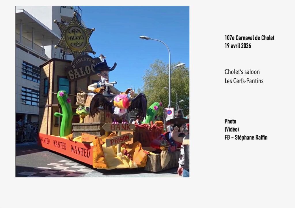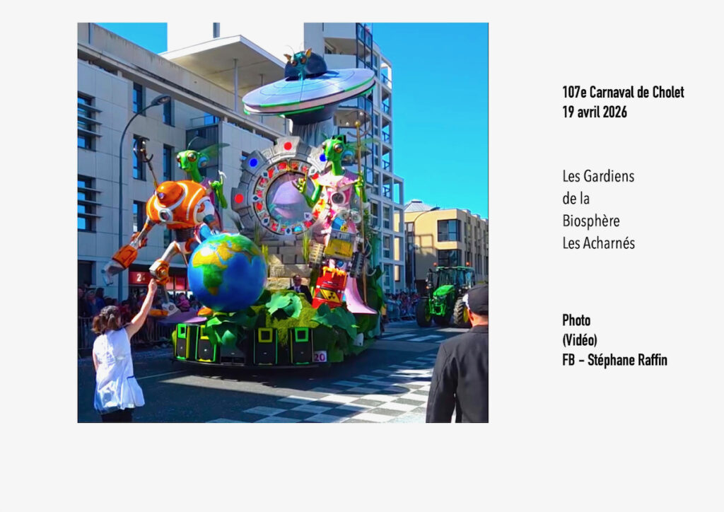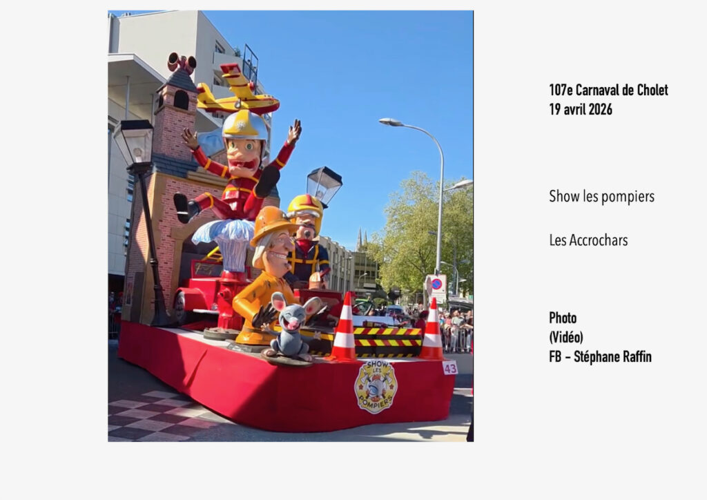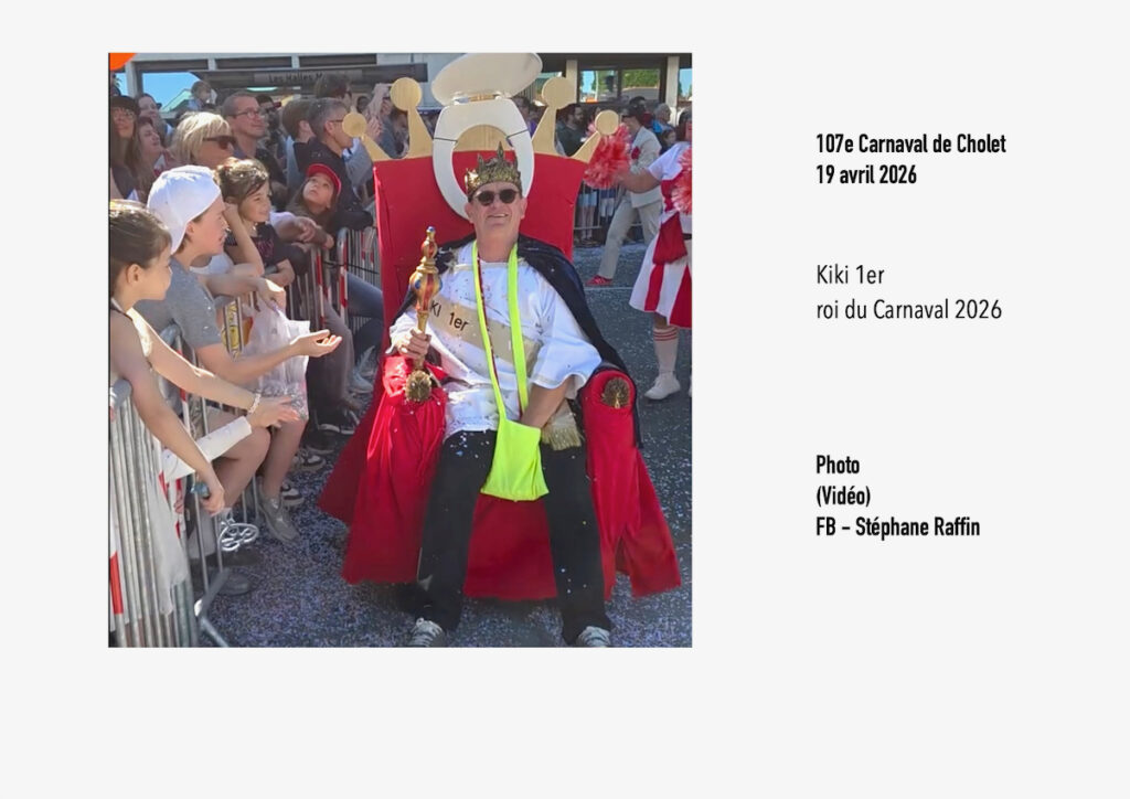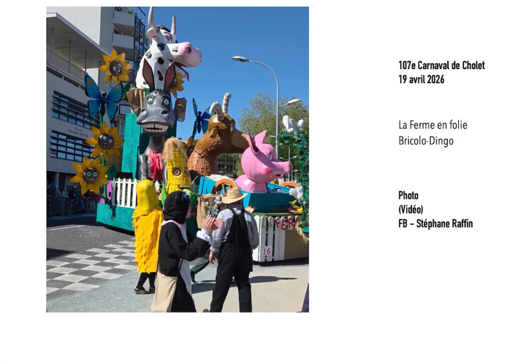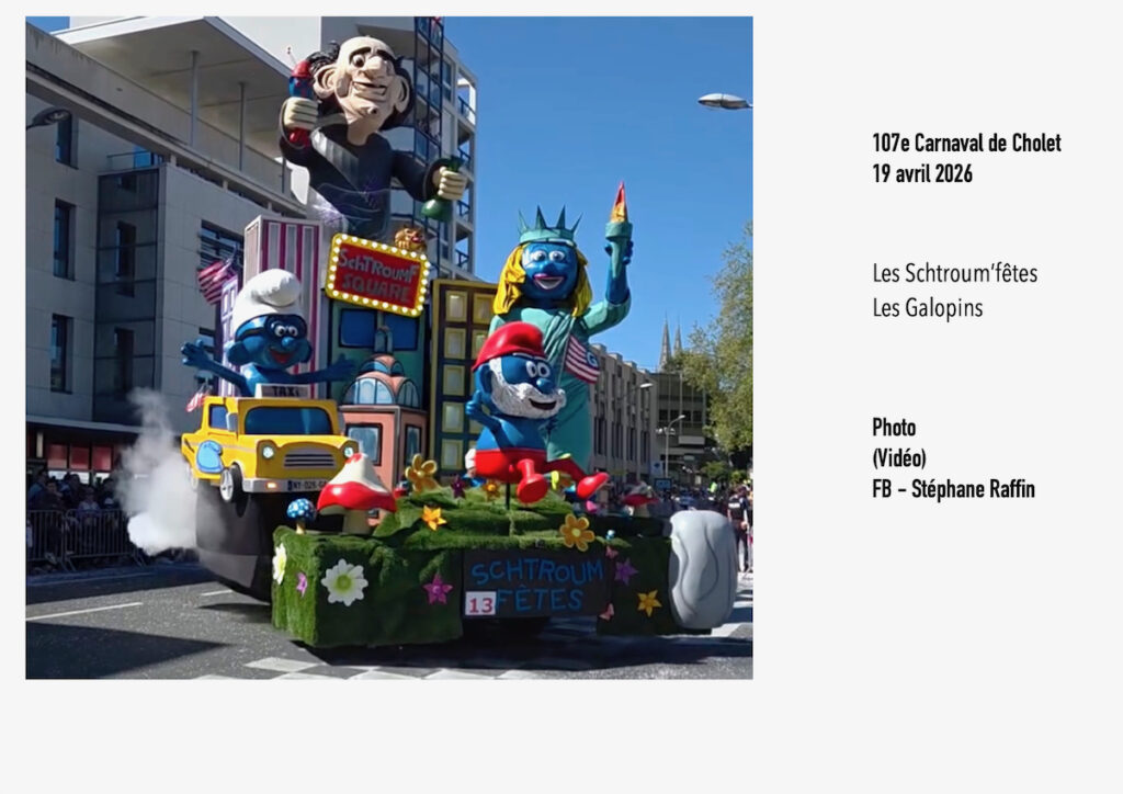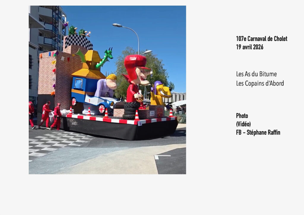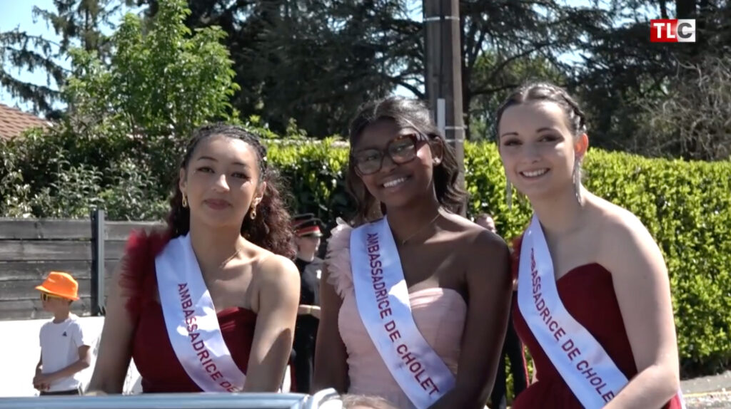 Dimanche 19 avril 2026 – Pour la première fois dans l’histoire du carnaval de Cholet, les ambassadrices, Ayllanie Zaoiedine, Tess Debierre, Noélie Pasquier, toujours privées de char, participent à leur seconde année carnavalesque, un peu serrées pour saluer le public dans la voiture qui les mène – même pas une voiture française…