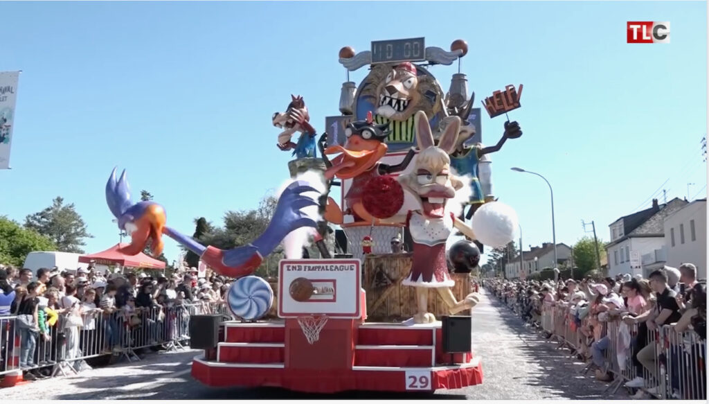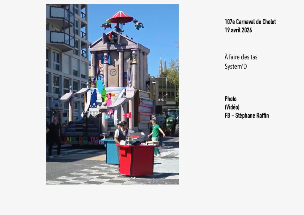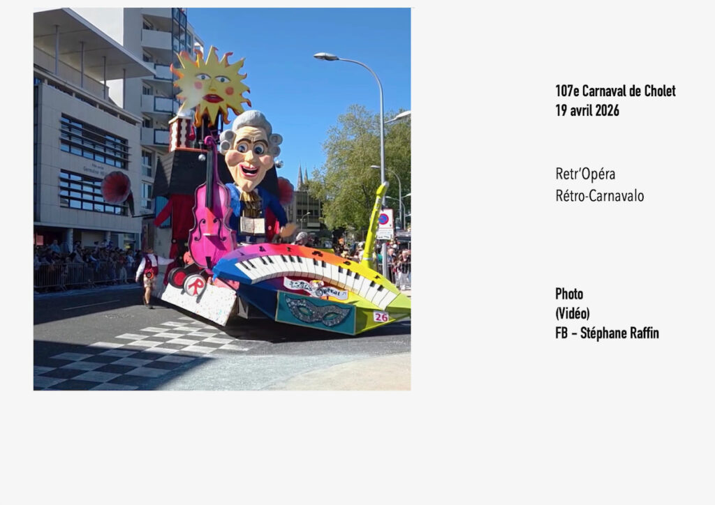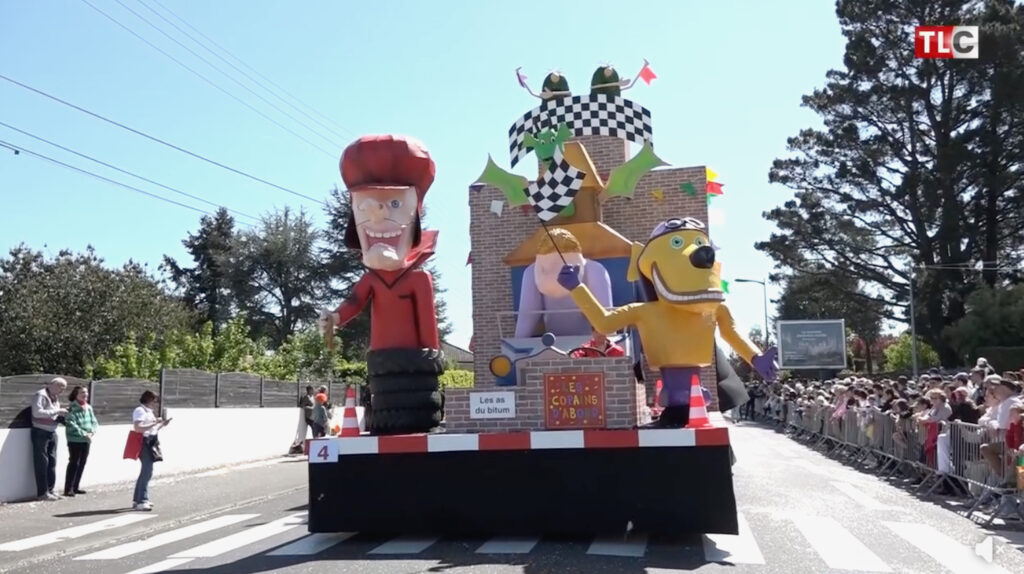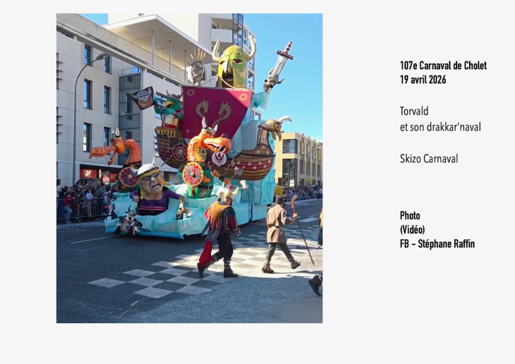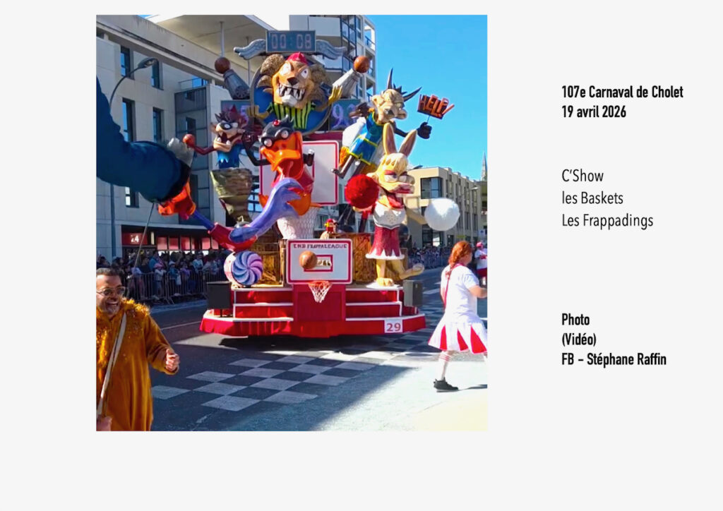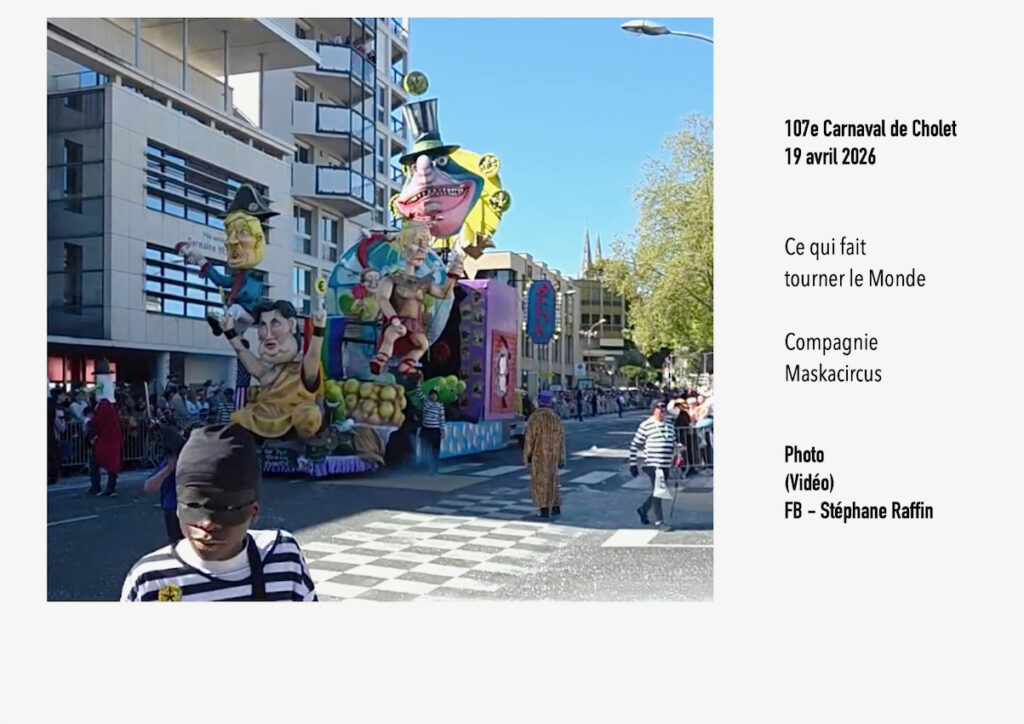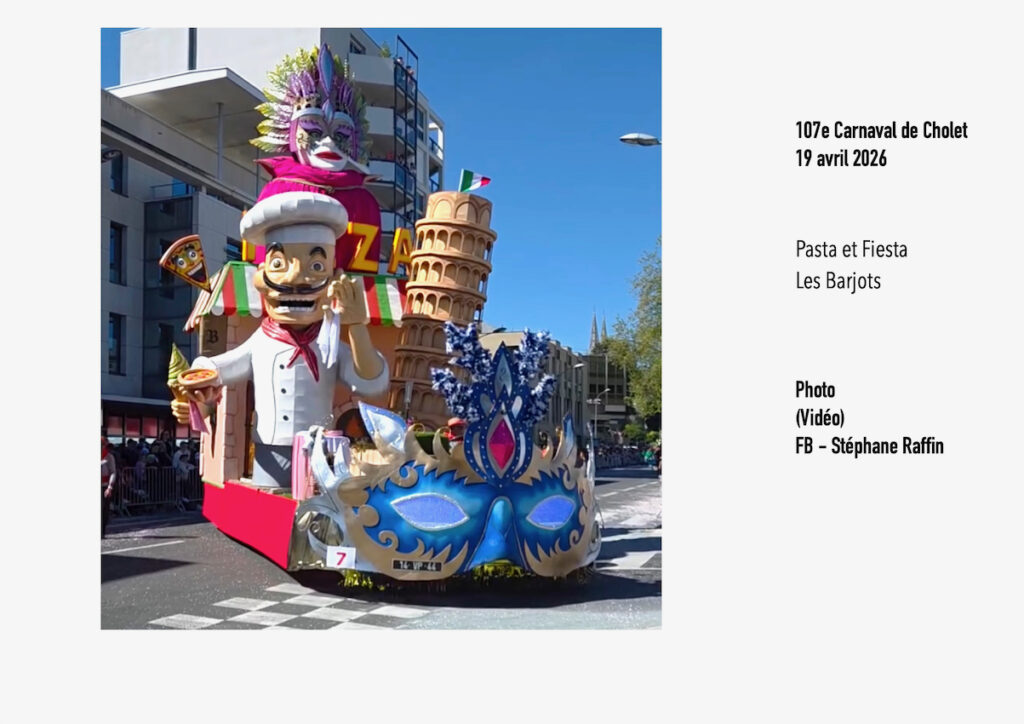 Dimanche 19 avril 2026 – Pour la première fois dans l’histoire du carnaval de Cholet, les ambassadrices, Ayllanie Zaoiedine, Tess Debierre, Noélie Pasquier, toujours privées de char, participent à leur seconde année carnavalesque, un peu serrées pour saluer le public dans la voiture qui les mène – même pas une voiture française…