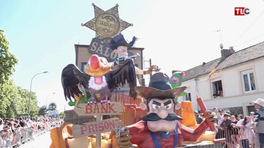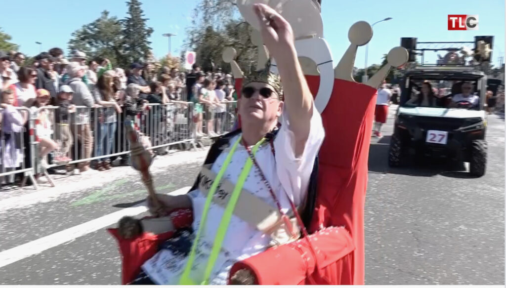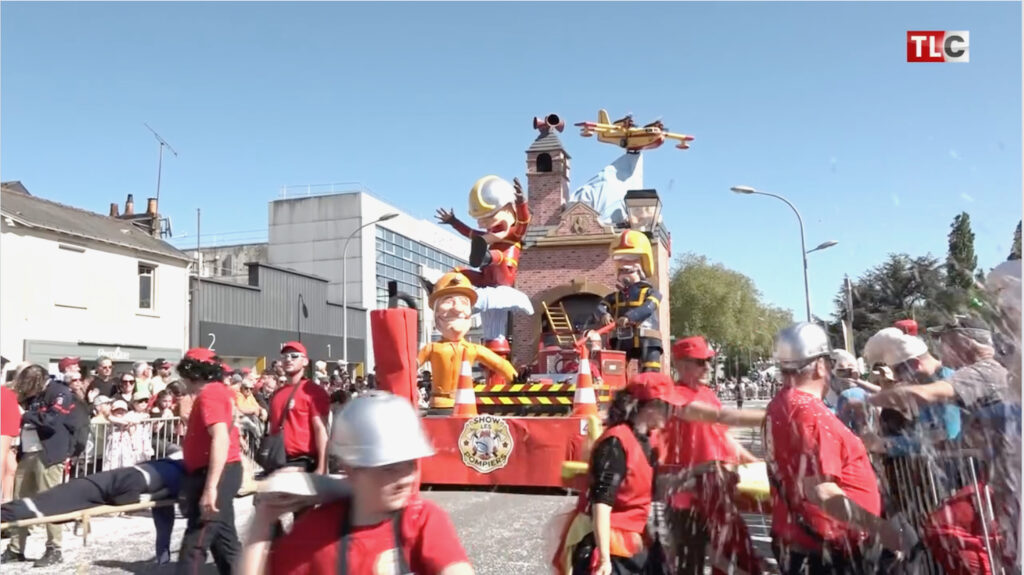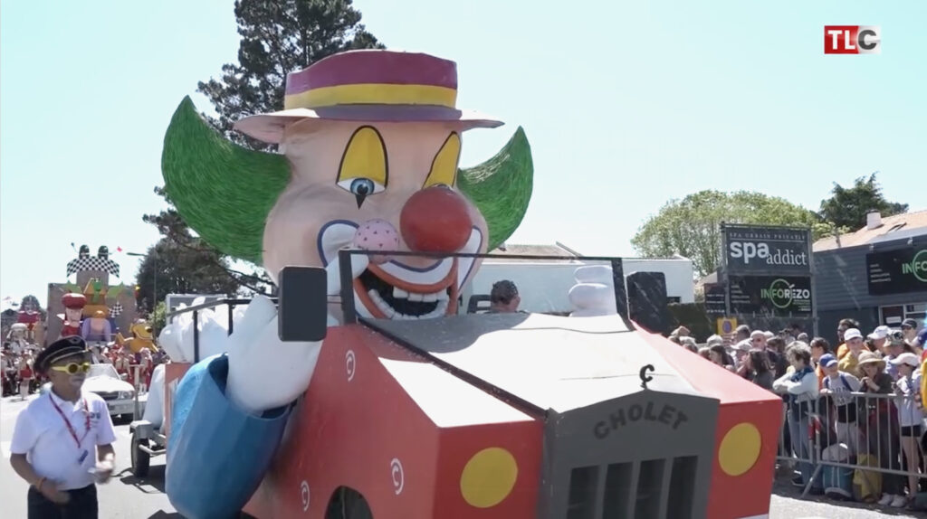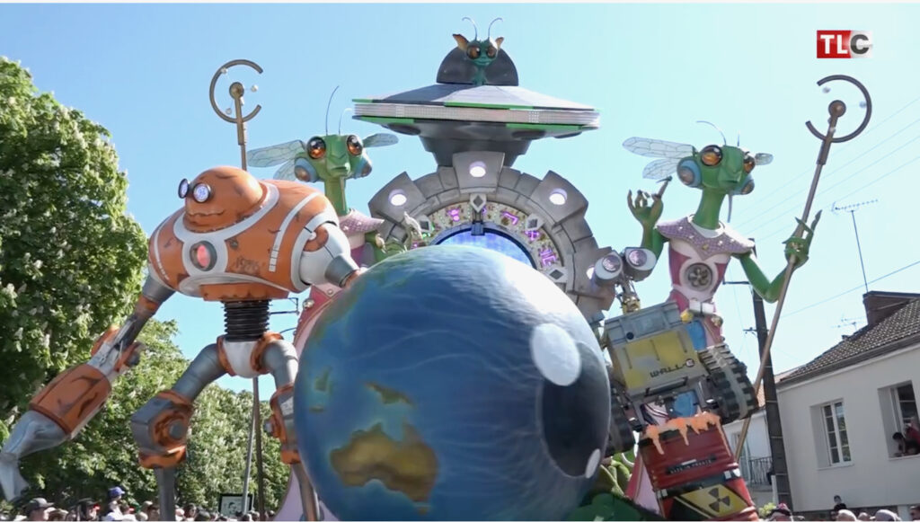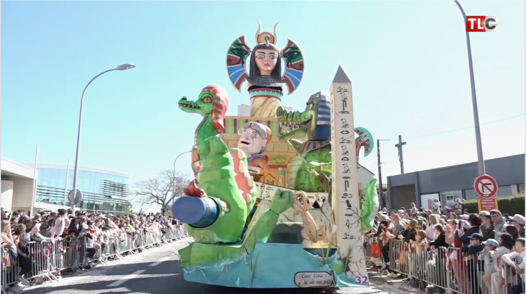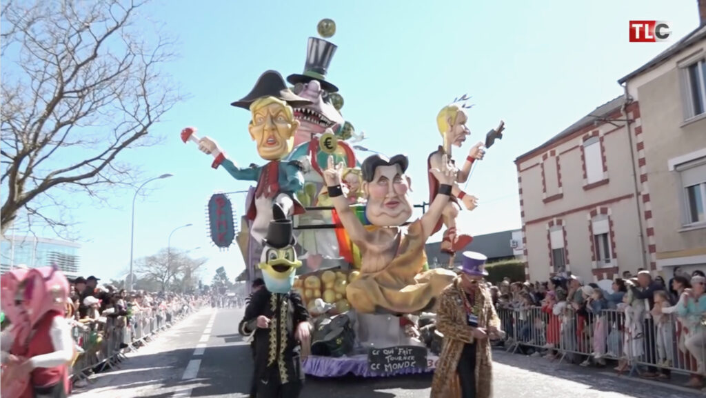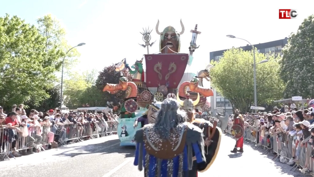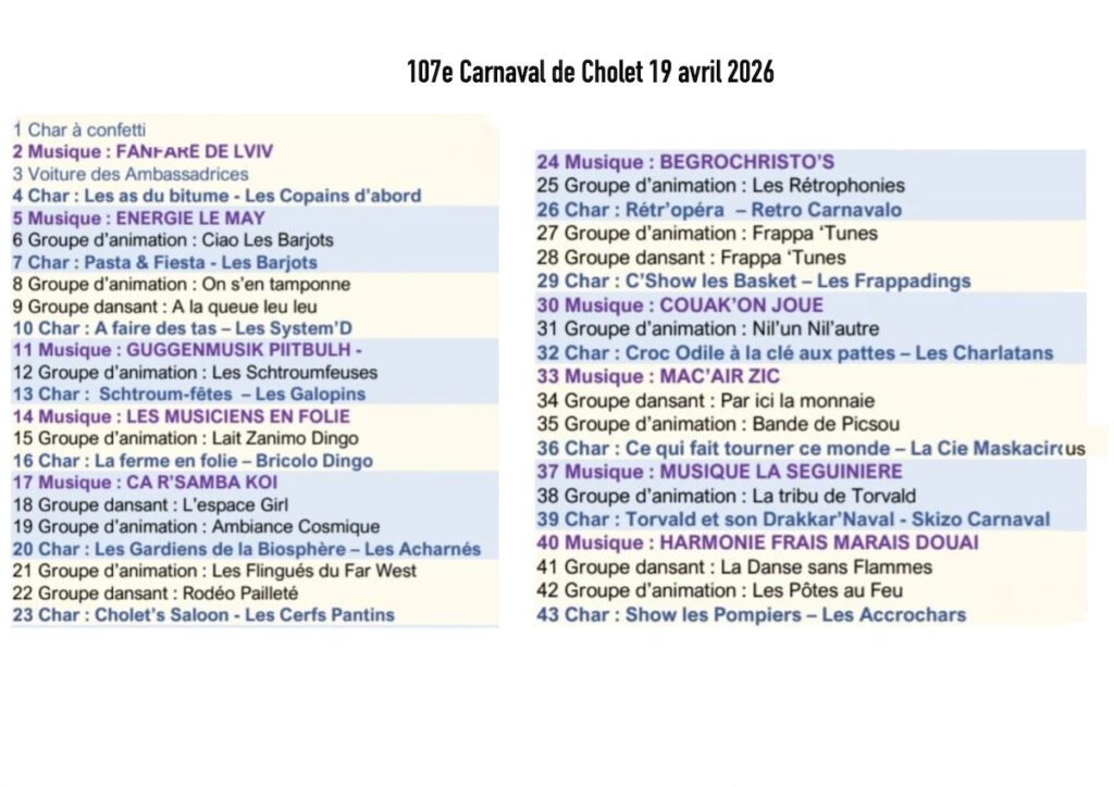 Dimanche 19 avril 2026 – Pour la première fois dans l’histoire du carnaval de Cholet, les ambassadrices, Ayllanie Zaoiedine, Tess Debierre, Noélie Pasquier, toujours privées de char, participent à leur seconde année carnavalesque, un peu serrées pour saluer le public dans la voiture qui les mène – même pas une voiture française…