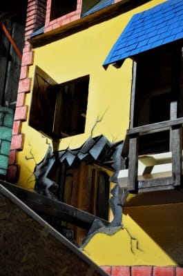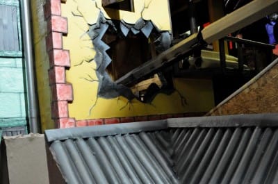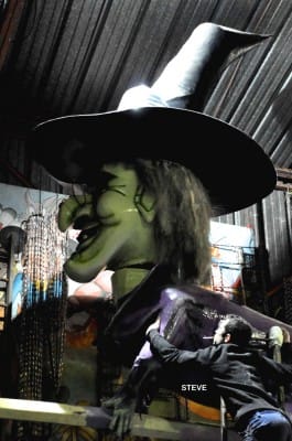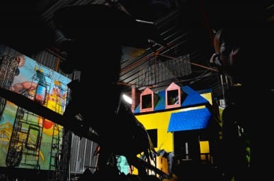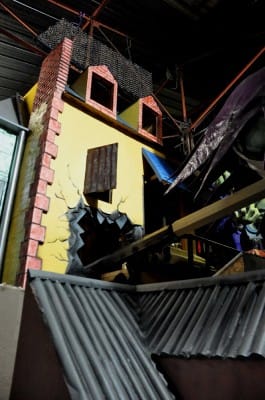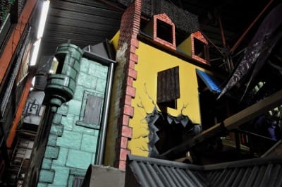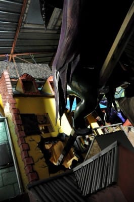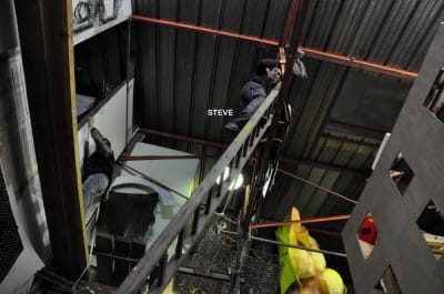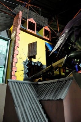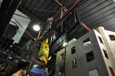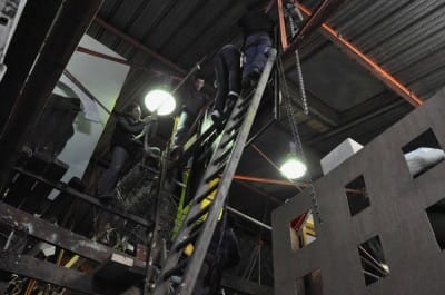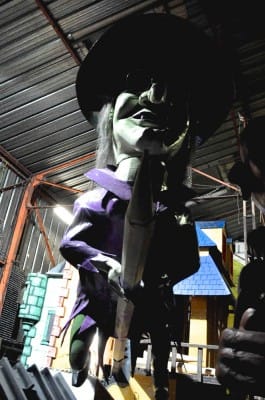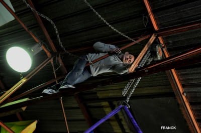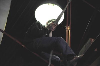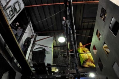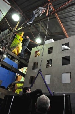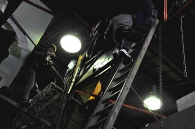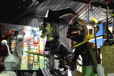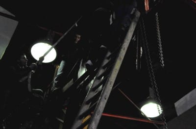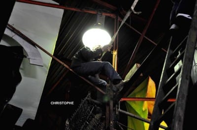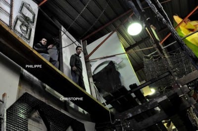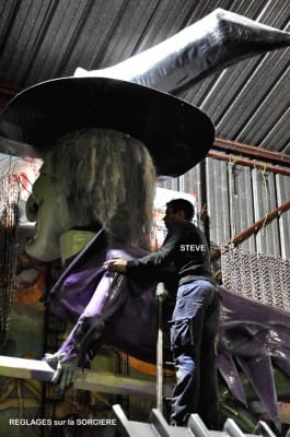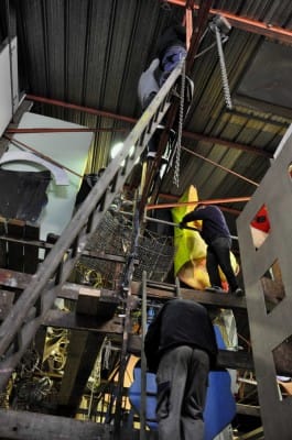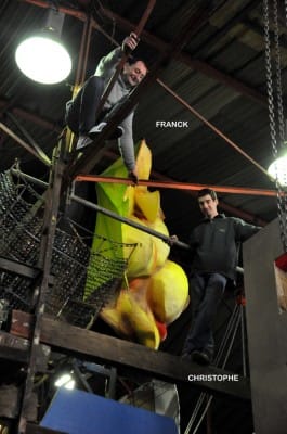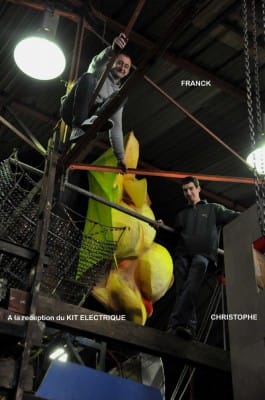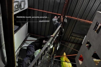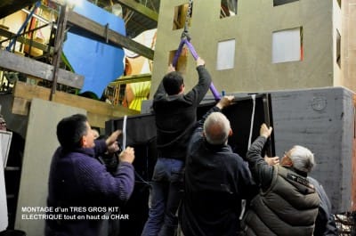 Les carnavaliers se baladent très haut dans la charpente du hangar. Comme des araignées, il faut savoir s’enfiler entre les fermes de la charpente pour terminer le char.