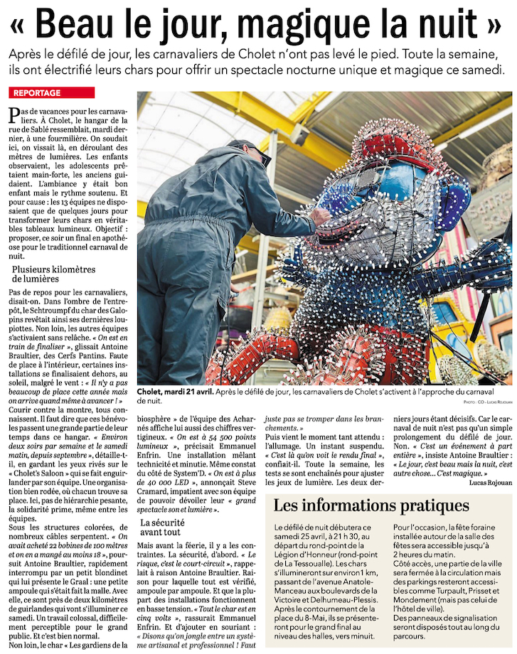 À l’heure de la vente aux enchères des sculptures de la Nuit de la Soudure au profit de l’association Enfance et Hôpital, les carnavalières et carnavaliers apportent leurs derniers soins aux illuminations (chars, costumes et accessoires) qui devraient enchanter la nuit du 25 au 26 avril 2026.