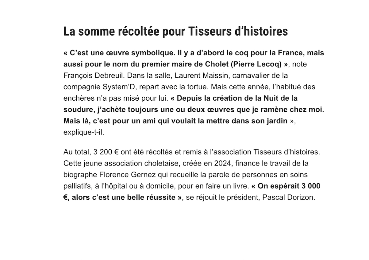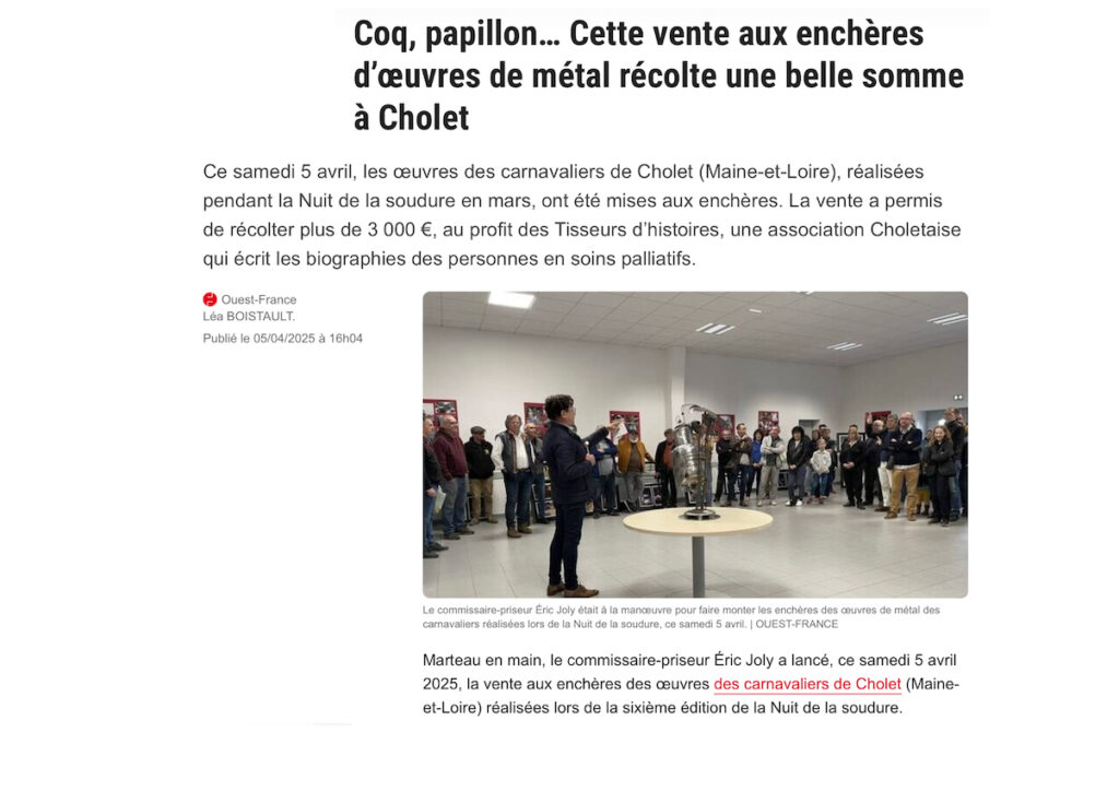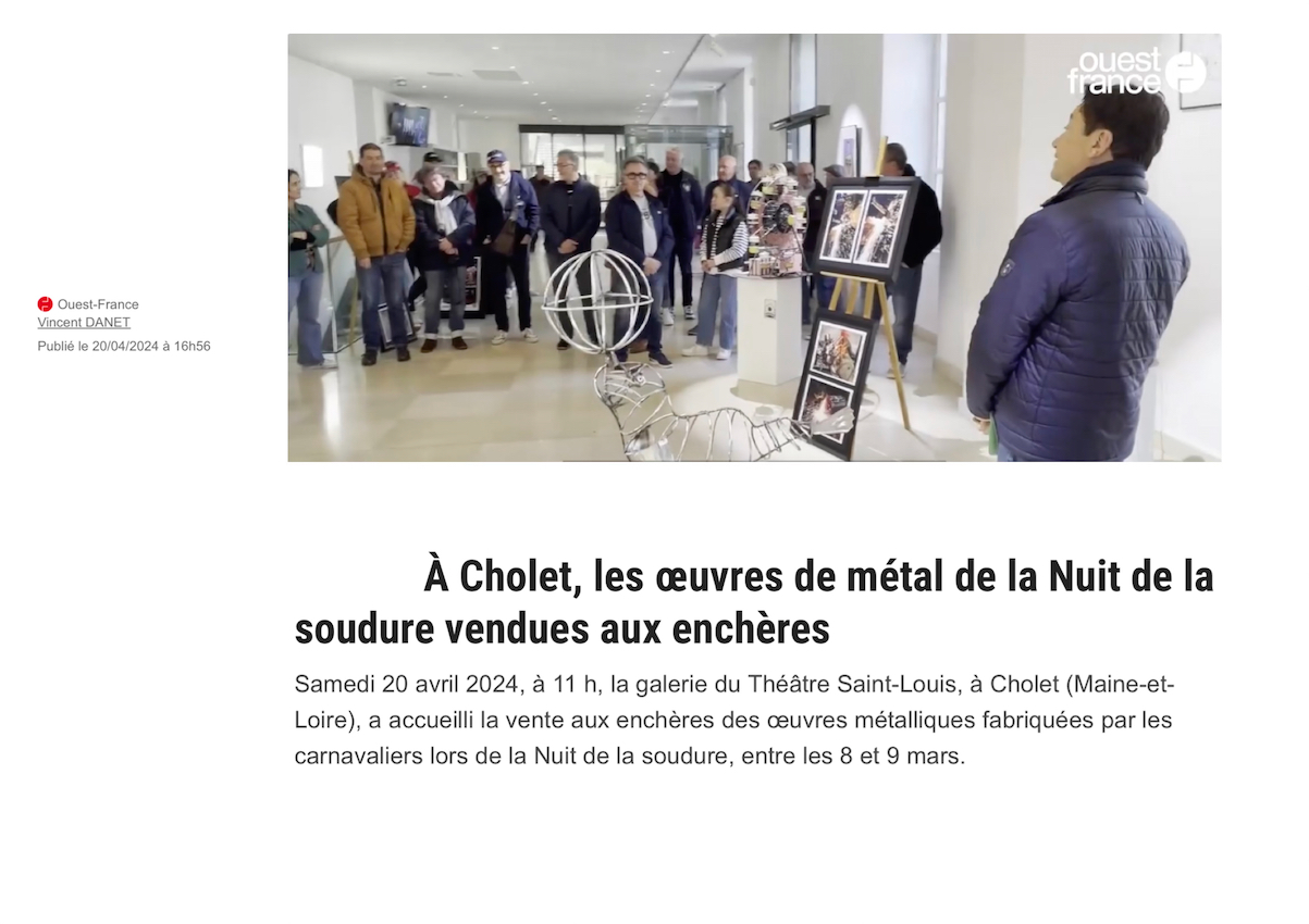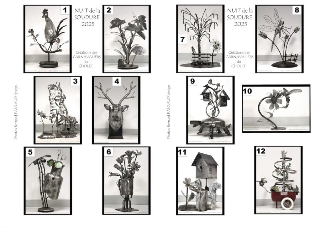 Jusqu’en 2023, la vente aux enchères des œuvres réalisées tout au long de la Nuit de la Soudure par les carnavaliers de Cholet se tenait le soir du dimanche des Portes ouvertes. (Photos Bernard F), En 2024, la vente aux enchères eut lieu au théâtre Saint-Louis ; en 2025 dans la salle de l’atelier des carnavaliers.