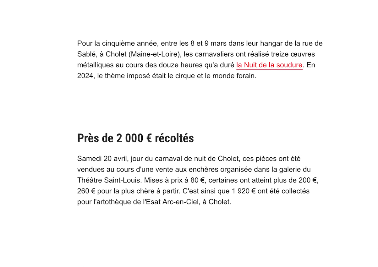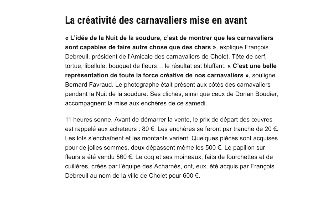 En 2019, l’Amicale des carnavaliers de Cholet, qui regroupe douze équipes, a souhaité raviver cette action de solidarité sous une forme nouvelle, dynamique et esthétique, en instaurant la Nuit de la Soudure suivie d’une vente aux enchères au profit d’une association reconnue d’intérêt général.