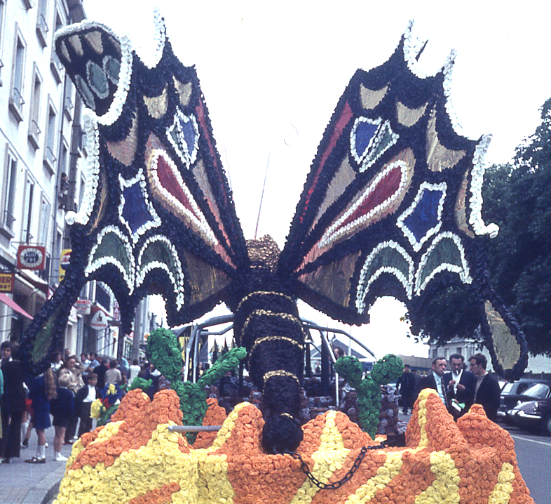 • Saumur – Défilé fleuri – 28 juin 1964 – sur le thème des Souvenirs de voyages, char : Parfum du Tyrol Centre-ville.