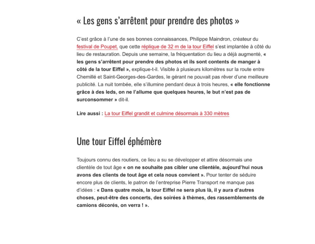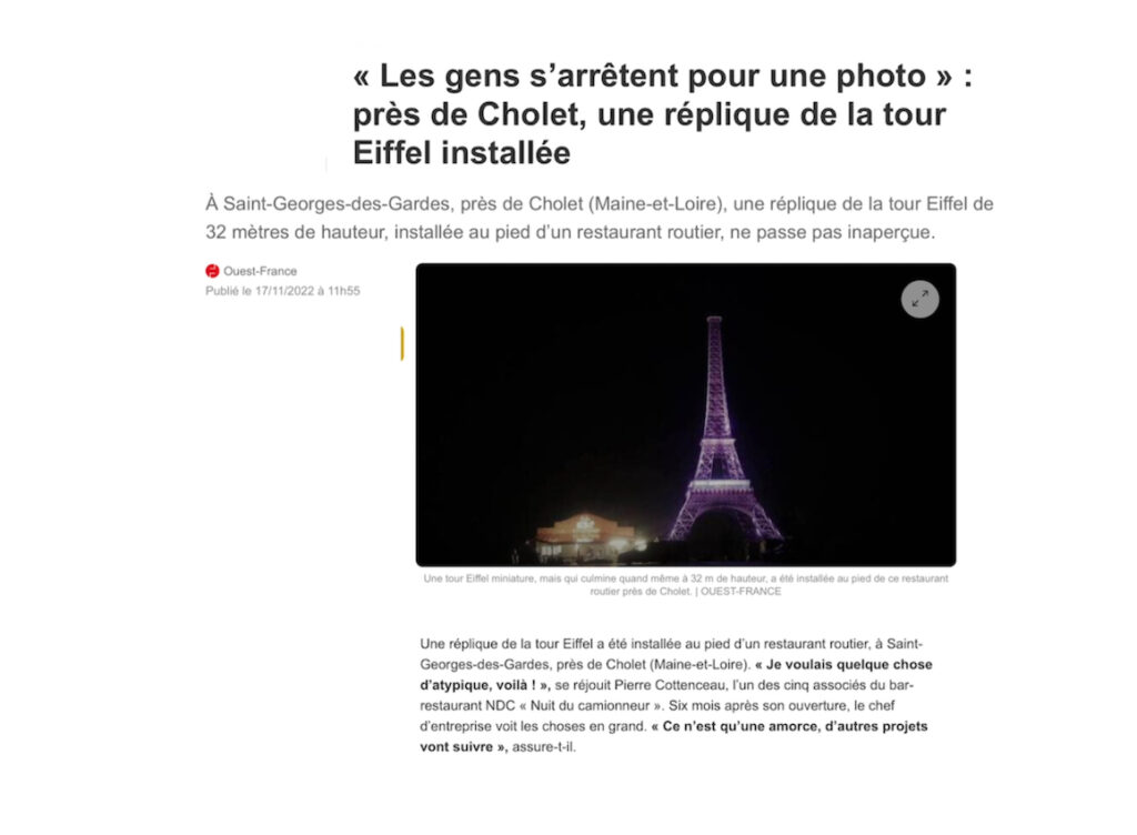 Parmi les constructions originales inspirées de la tour Eiffel, voici celle que Philippe Maindron a imaginée. Cette Tour Eiffel a concurrencé le sommet de l’Anjou près de Saint-Georges-des-Gardes. Mais, appelée à voyager, elle a rejoint sa grande sœur sur le Champ de Mars à Paris. Son illumination a été confiée aux électriciens de l’équipe System’D. (Photos Bernard F)