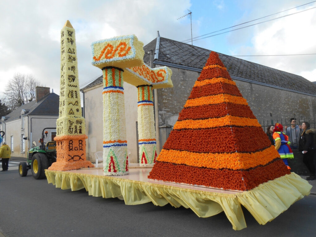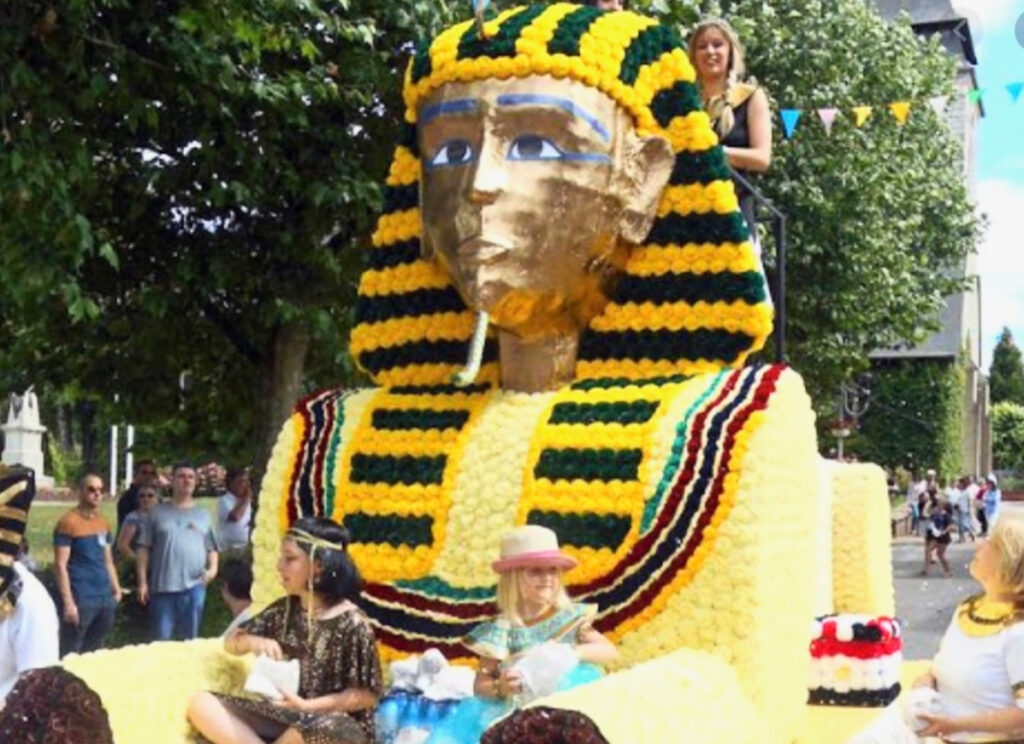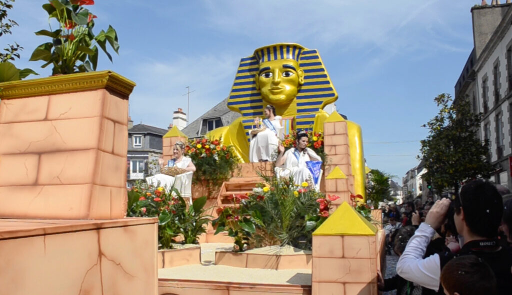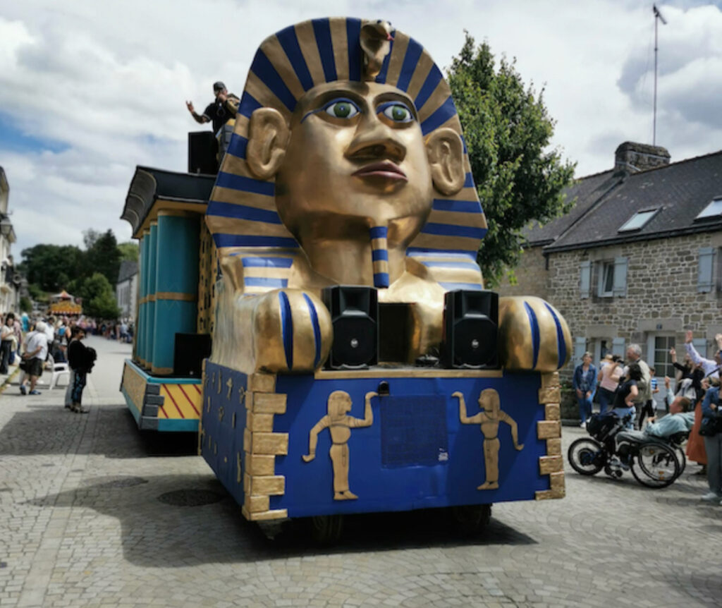 5 mai 2019, 93e édition du carnaval de Ploërmel – Morbihan – 9 600 habitants. Les Ploërmelaises et Ploërmelais assurent la réussite de leur fête en effectuant des échanges. D’une part, les carnavaliers de Ploërmel utilisent des éléments de chars de Cholet. D’autre part, leurs chars défilent aussi à Fougères. Photo du char égyptien : 4 mai 2014.