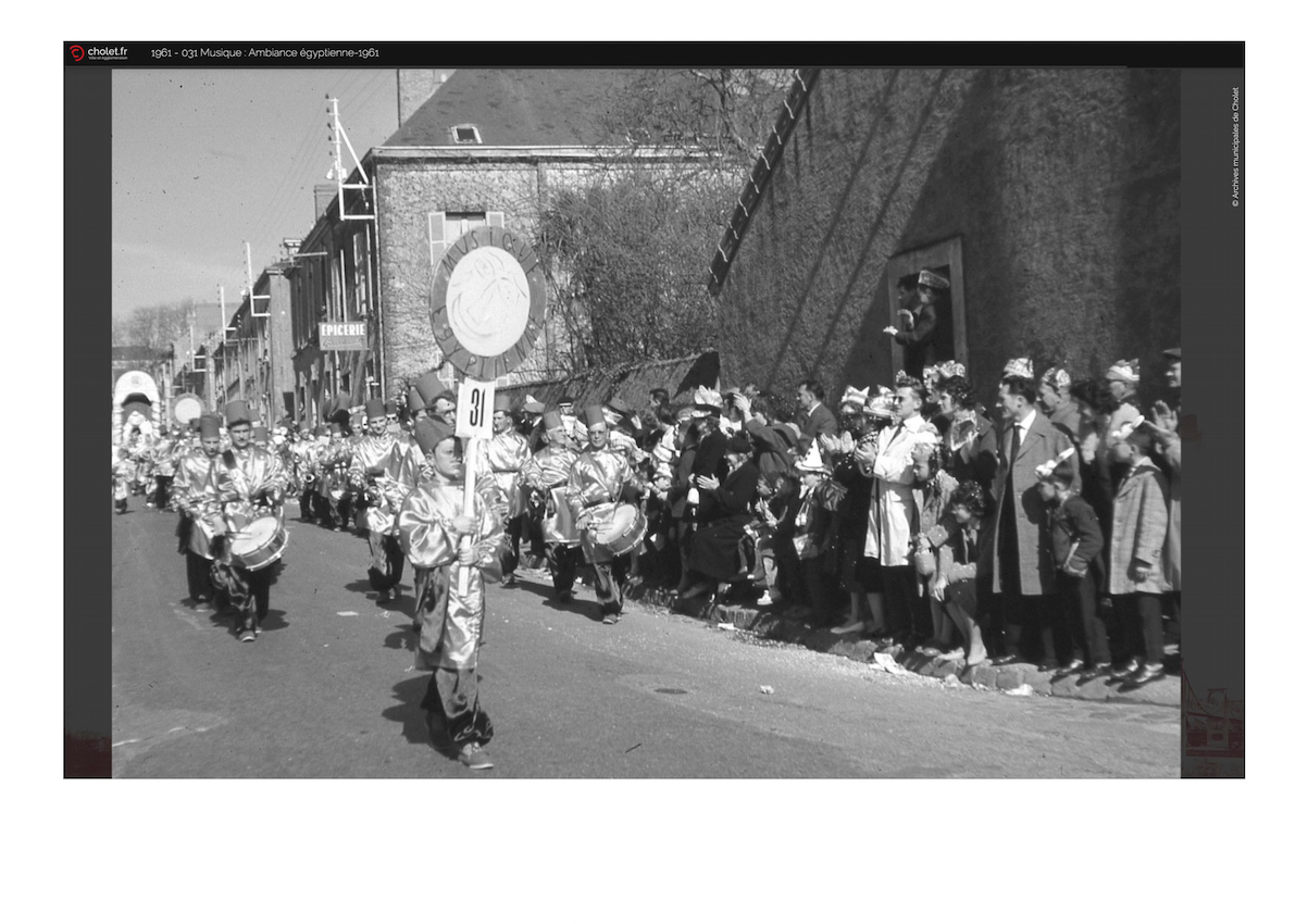 - Mortagne-sur-Sèvre, 5 mars 1961- L’équipe Grolleau (dissidente de la mi-carême de Cholet) présente Au Pays de Giseh et le char Le Sphinx.