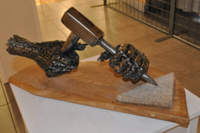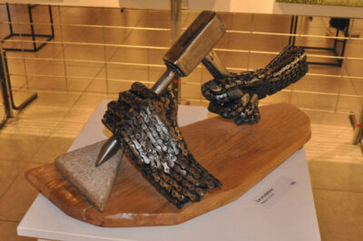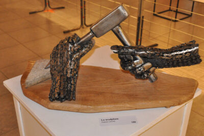 Les mains habiles de l’artiste Patrick ont sublimé l’art de manier la chaîne pour créer des mains délicates de sculpteur qui burine, de ciseleur, de pianiste…