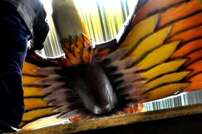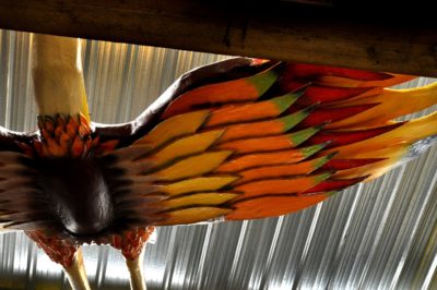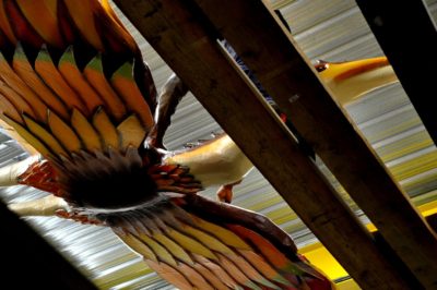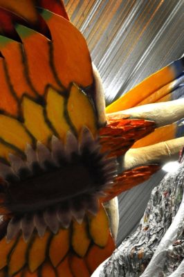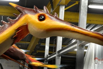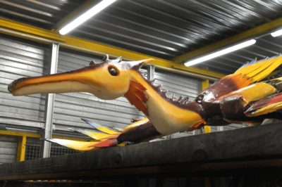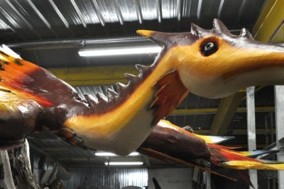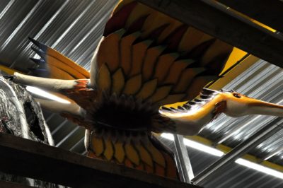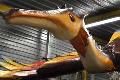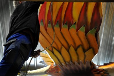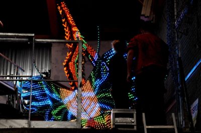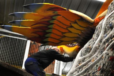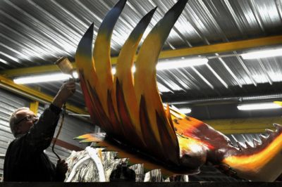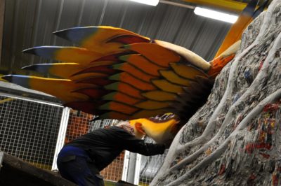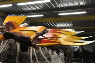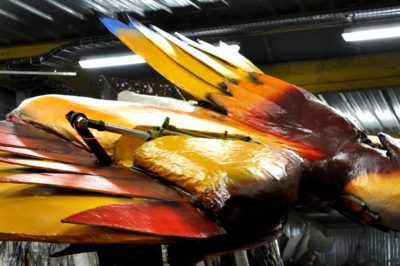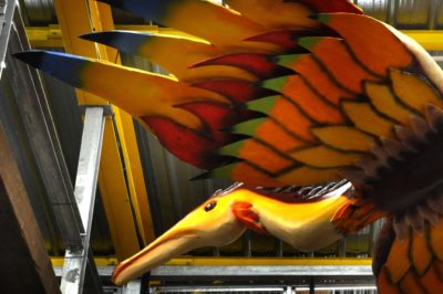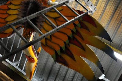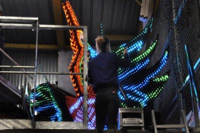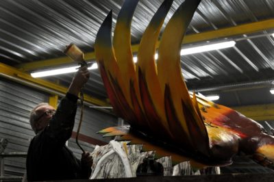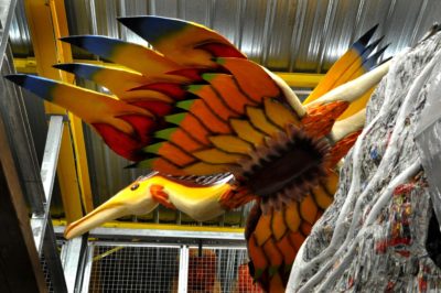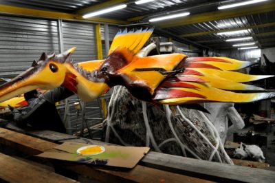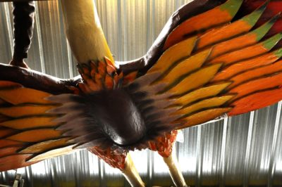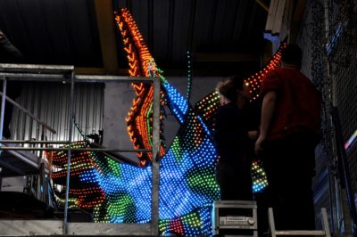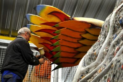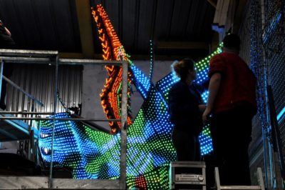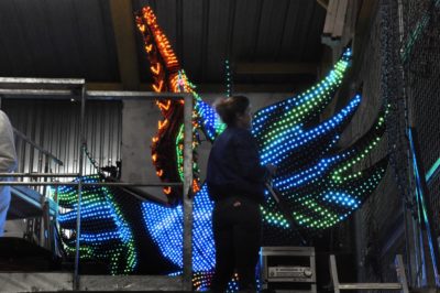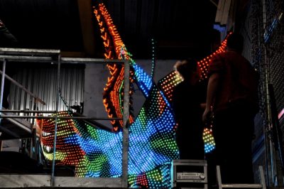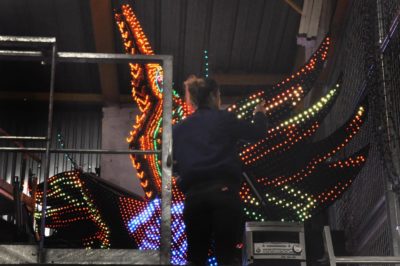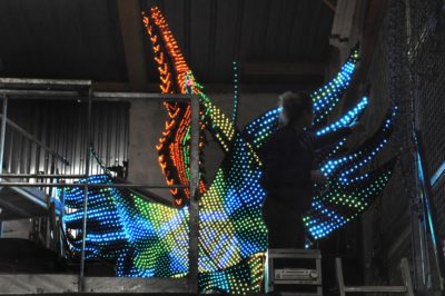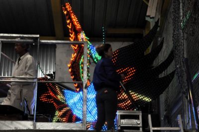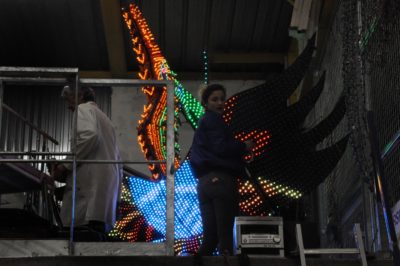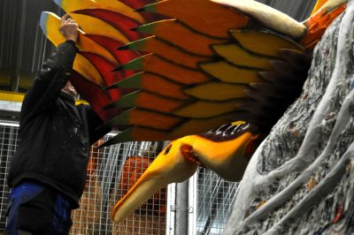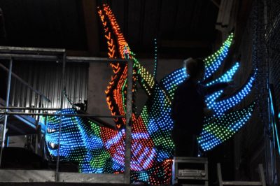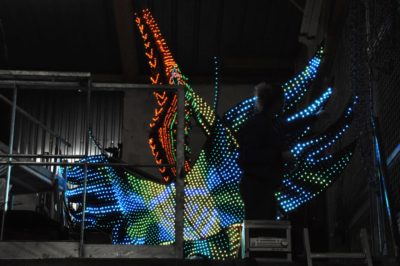 Voici l’oiseau de nuit. Ilona, la dresseuse, veille à ce que son oiseau s’éclaire correctement, d’autant que ses centaines de plumes lumineuses devront s’allumer et changer de couleur sur le rythme exact de la musique diffusée sur le char pour les différents groupes dansants qui le précèderont.