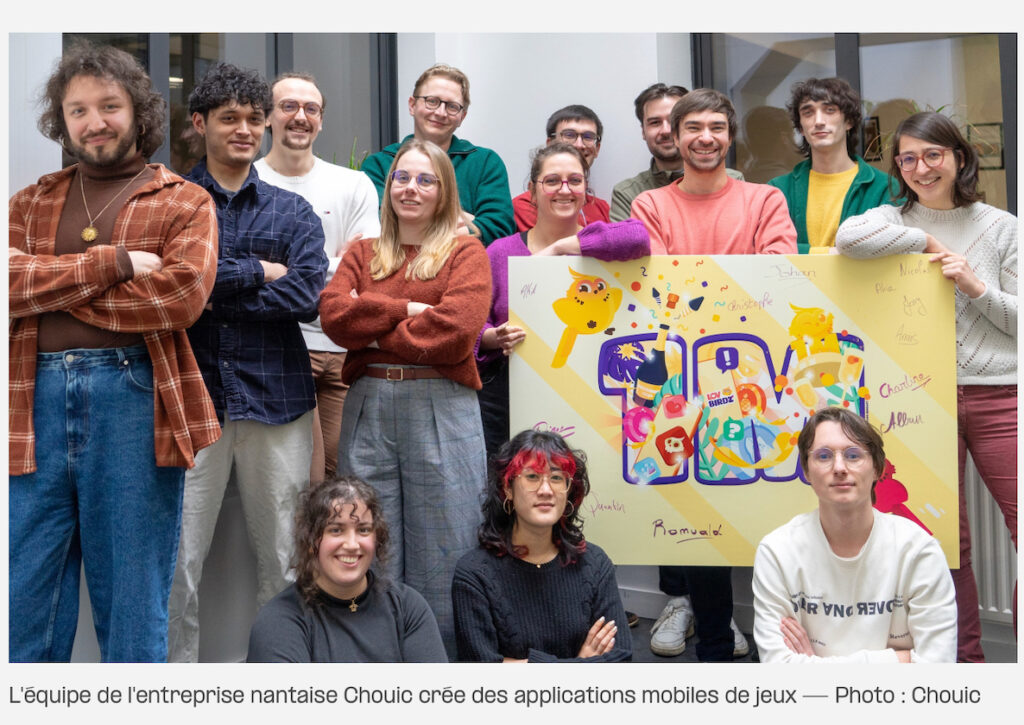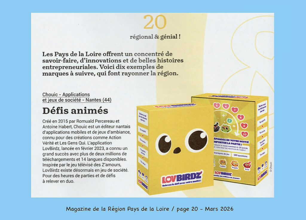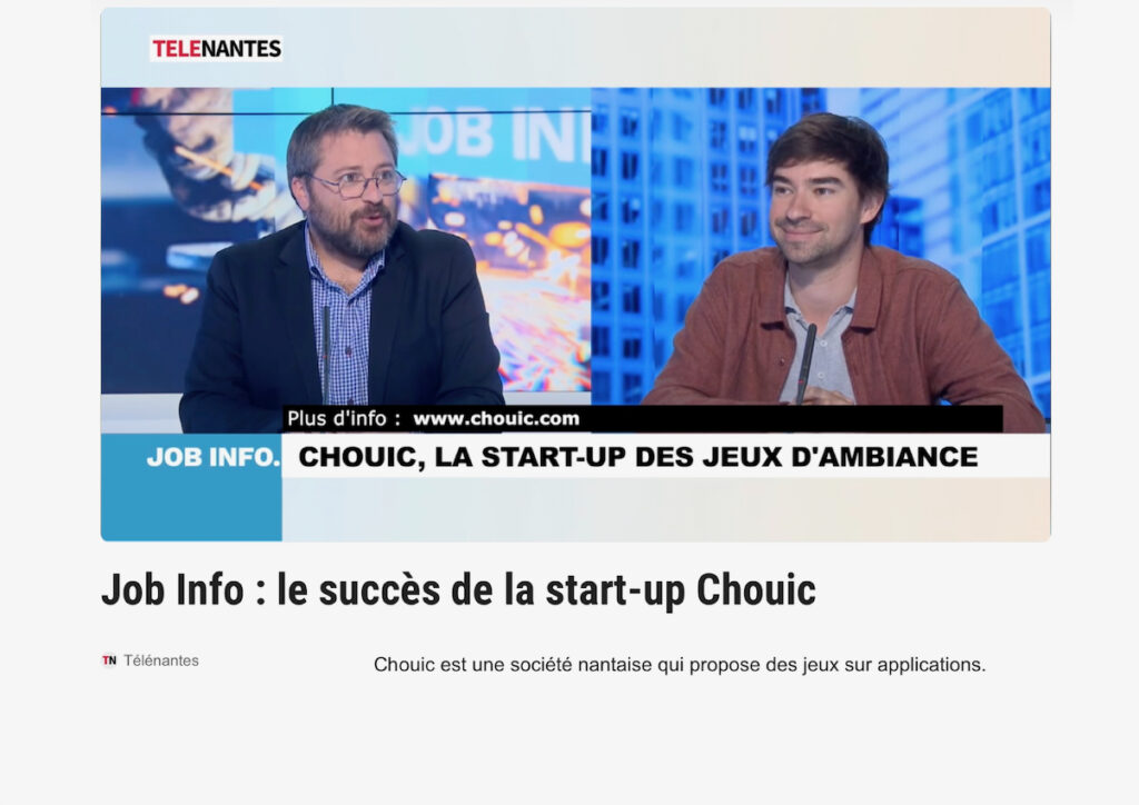 Fondée en 2015 à Paris par Romuald et Antoine – développeurs, installée à Nantes depuis 2020, la start-up Chouic crée et propose des jeux d’ambiance sous forme d’applications mobiles et de jeux de société, avec un parti pris : l’international, et une ambition : devenir une référence sur ce créneau du marché du divertissement.